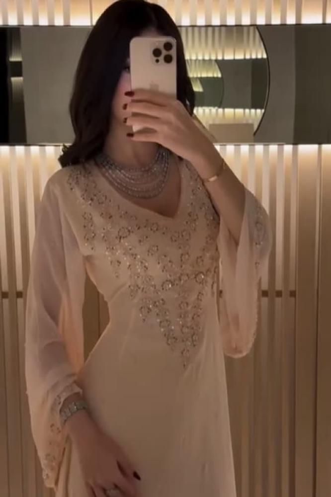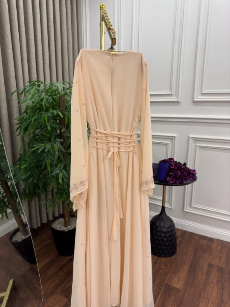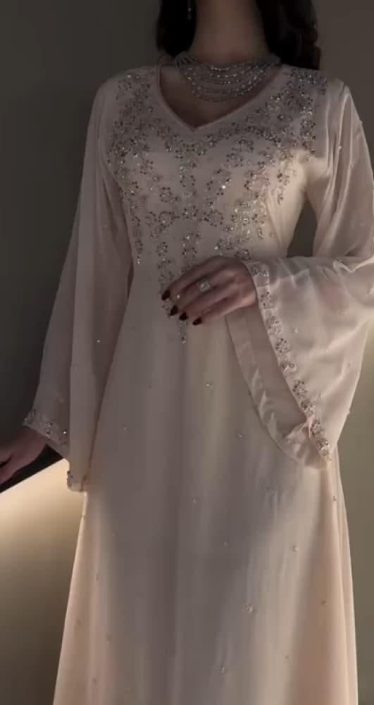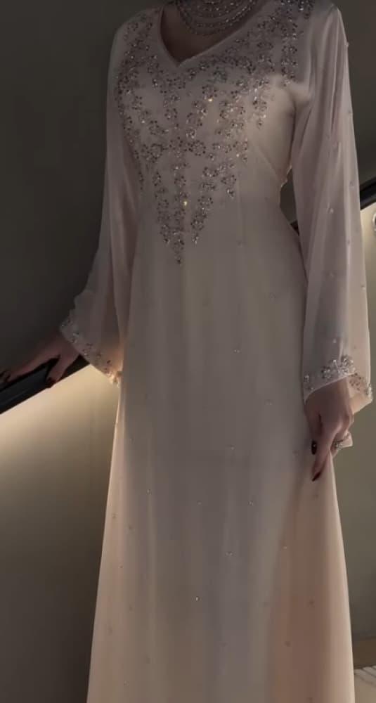 - الأكمام: طويلة وشفافة بتطريز ناعم لإضفاء لمسة من الفخامة والرقي.