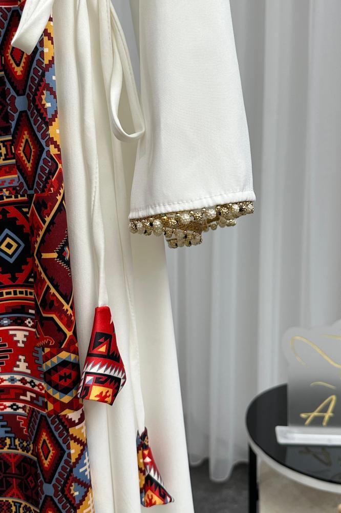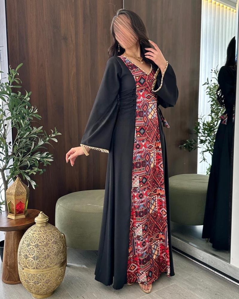 • نوع القماش: كريب ناعم مع قماش منقوش بتصميم تراثي.