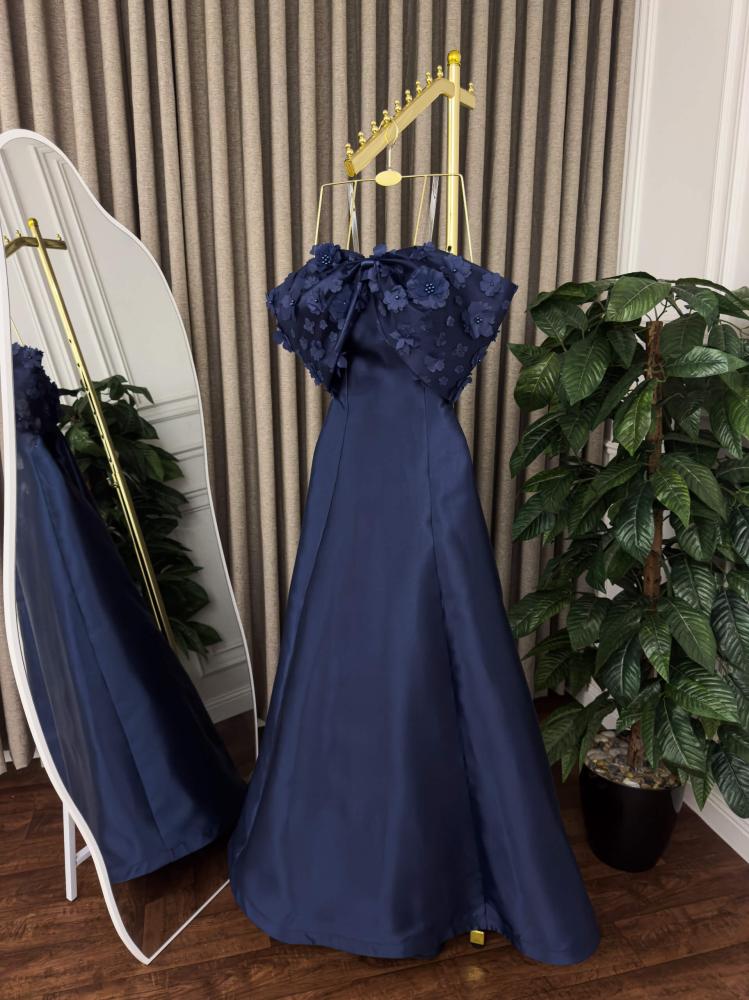 فستان سهرة طويل بقصة كلاسيكية، يتميز بتصميم بسيط وأنيق مع تفصيل ملفت على الكتفين.