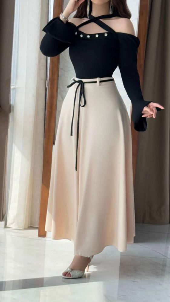 • الألوان المتناسقة (الأسود والأوف وايت) تناسب جميع ألوان البشرة، مما يجعله خياراً مثالياً لكل امرأة.