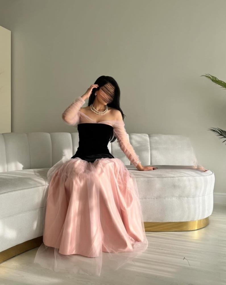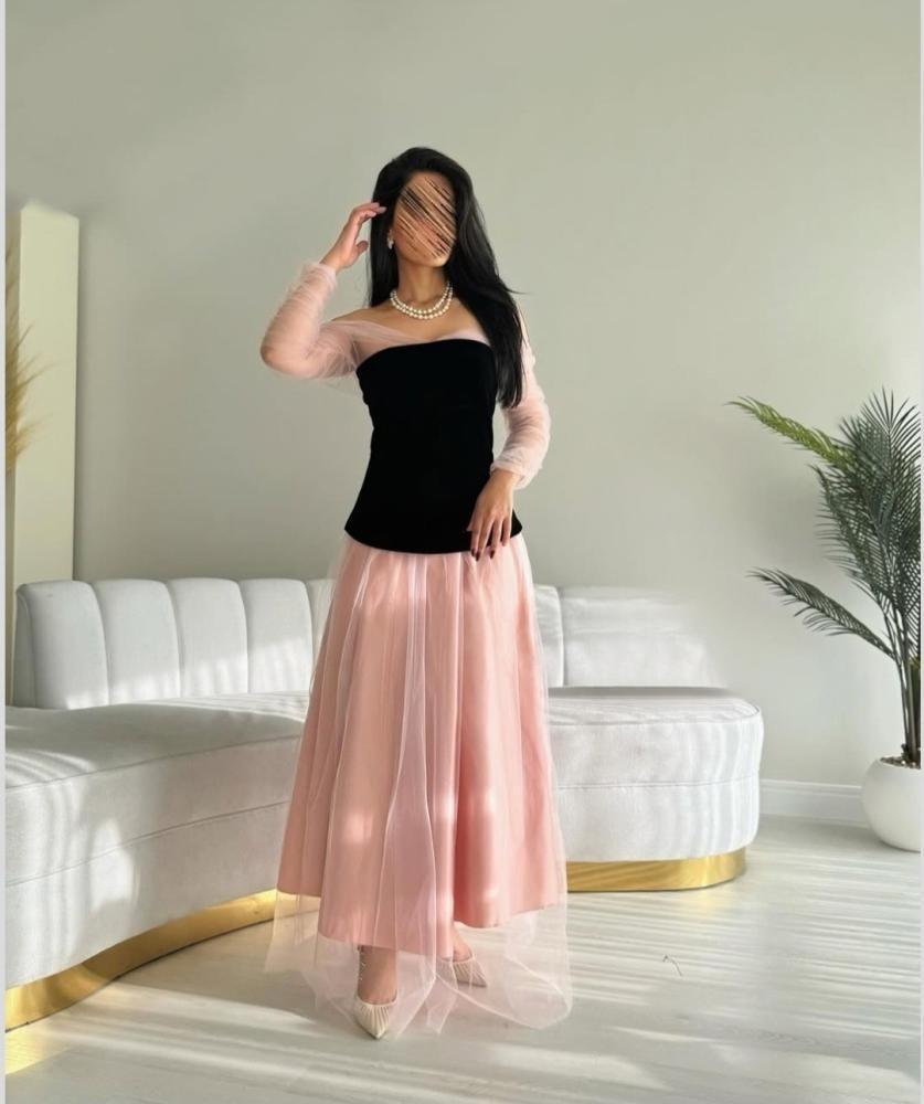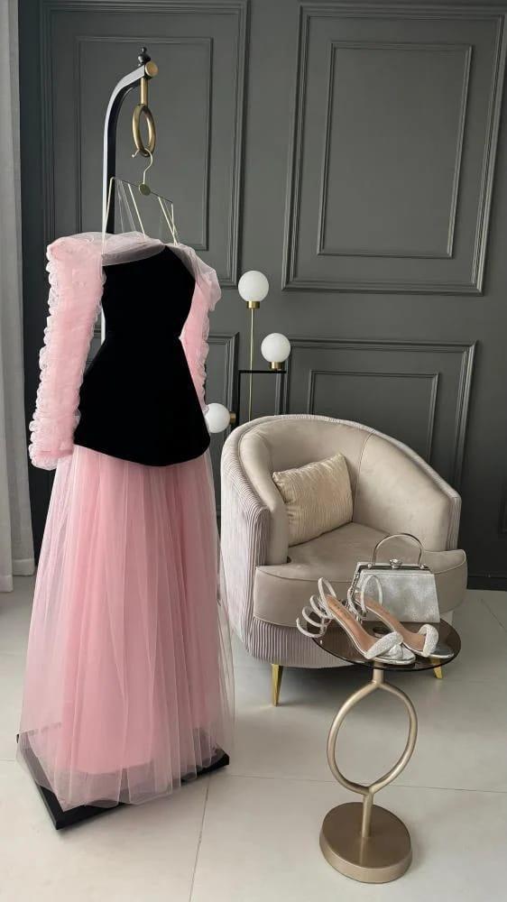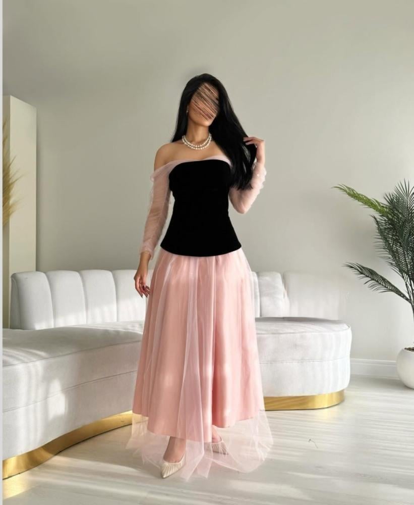 اللون: الأسود للجزء العلوي والوردي الفاتح للتنورة لإطلالة أنثوية راقية.