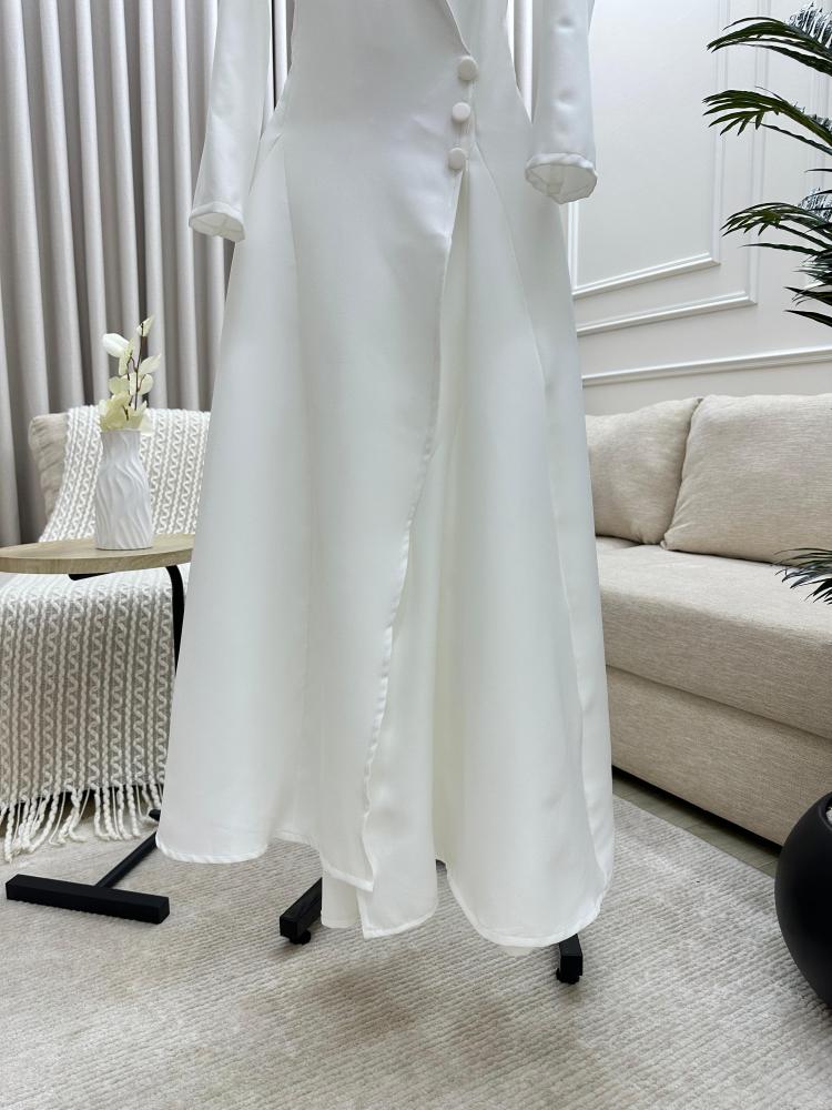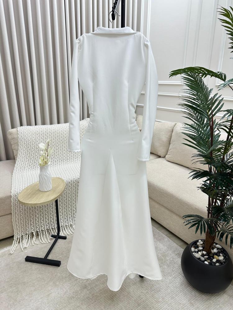 فستان العيد ناعم ساتر ابيض بأكمام وياقة رسمية