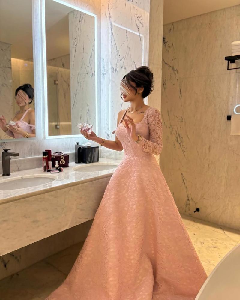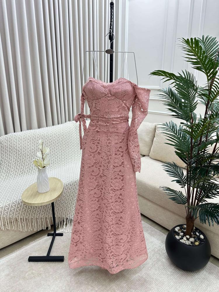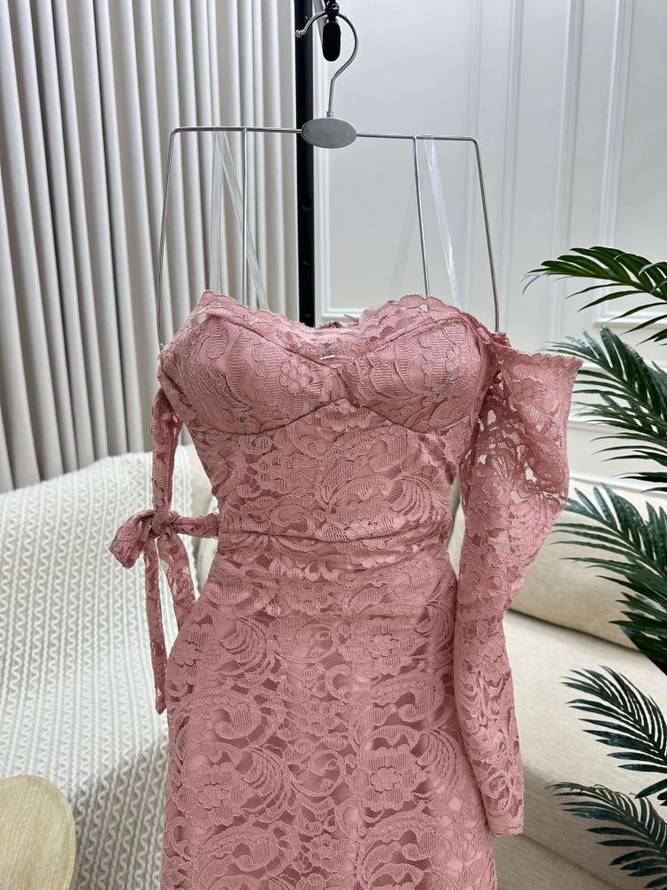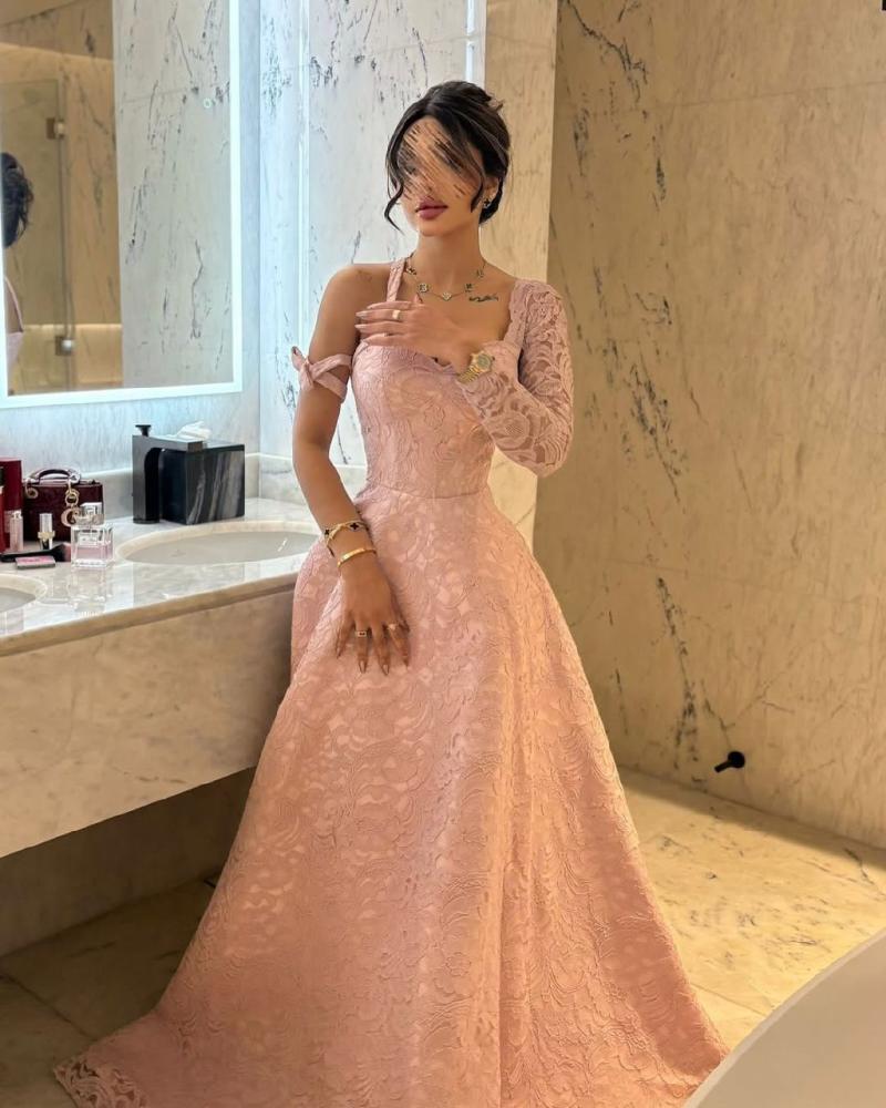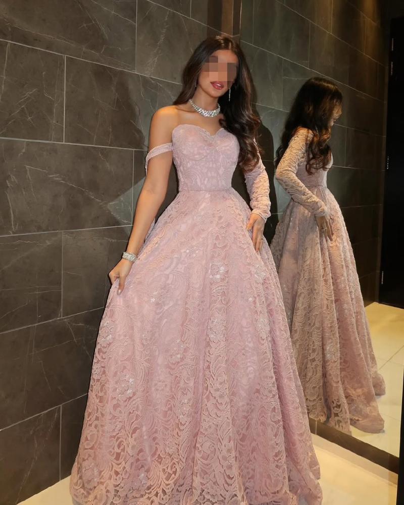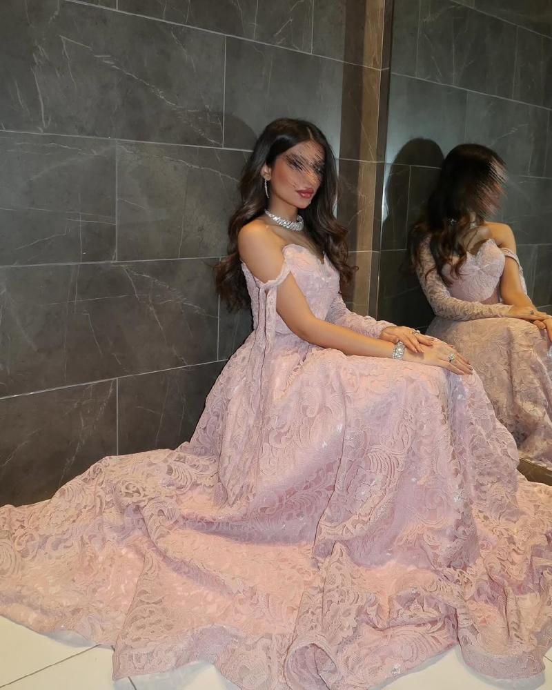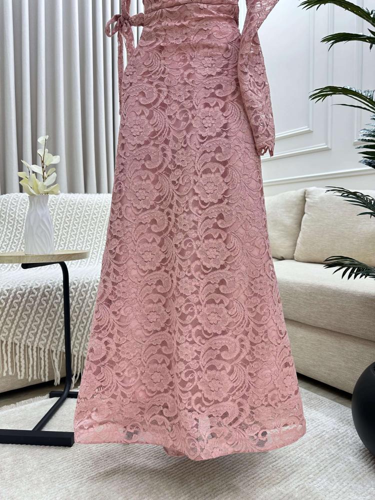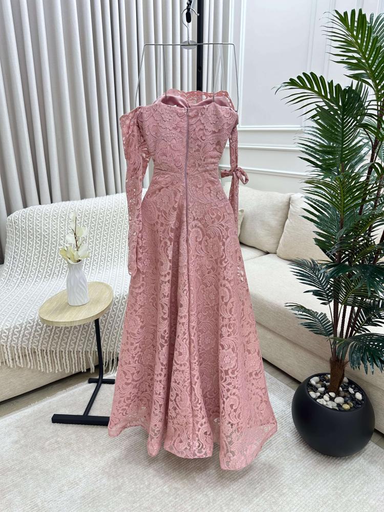 الفستان مصنوع من الدانتيل الفاخر بطبقات ناعمة من التول المبطن، ما يمنحه مظهرًا راقيًا وفخمًا يناسب المناسبات المميزة.