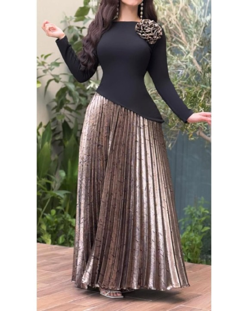 • الجزء السفلي: تنورة طويلة بستايل بليسيه معدني لامع تضفي حركة ساحرة وانسيابية رائعة.
