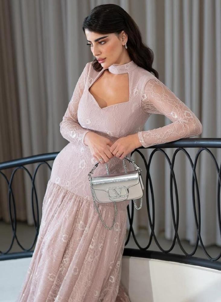 • الجزء العلوي: مزيّن بنقوش دانتيل ناعمة مع خطوط دقيقة تعزز المظهر الأنثوي.