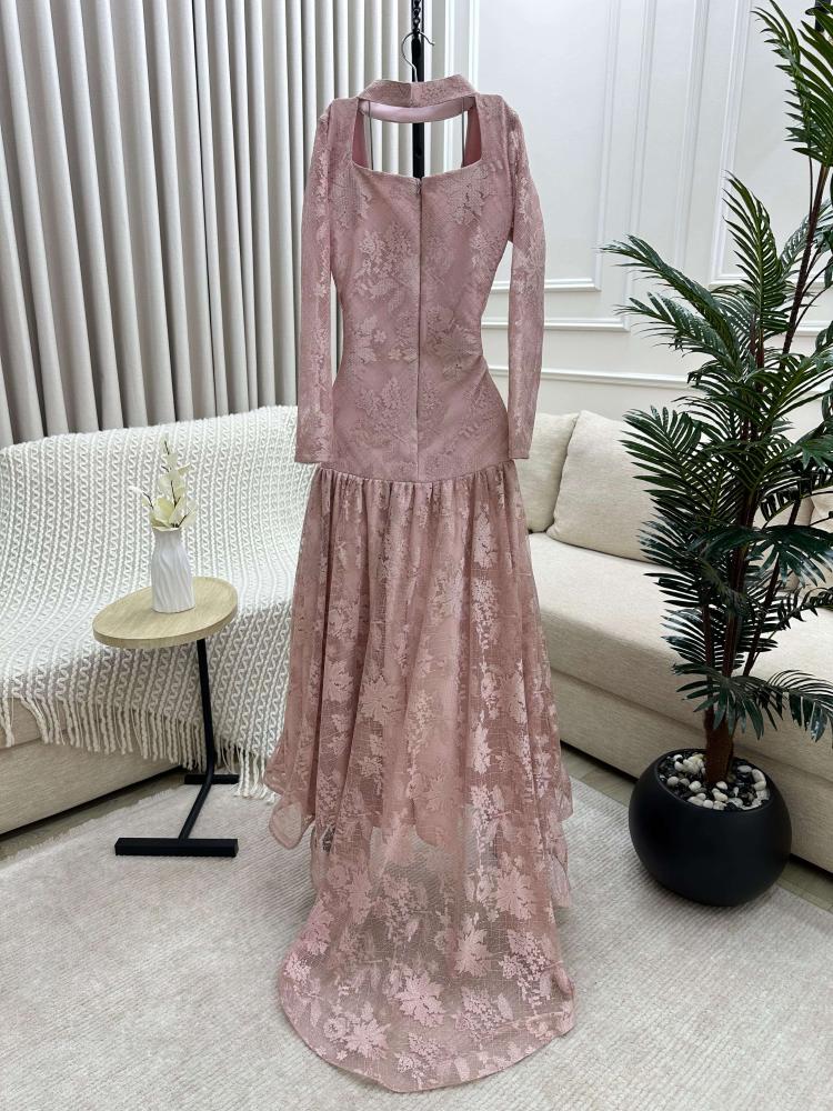 • الأكمام: طويلة وشفافة بالكامل، تعزز أناقة الإطلالة بلمسة فريدة.
