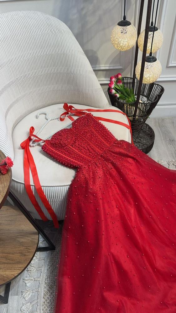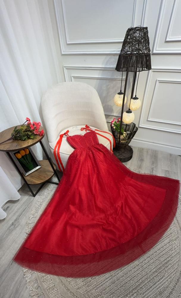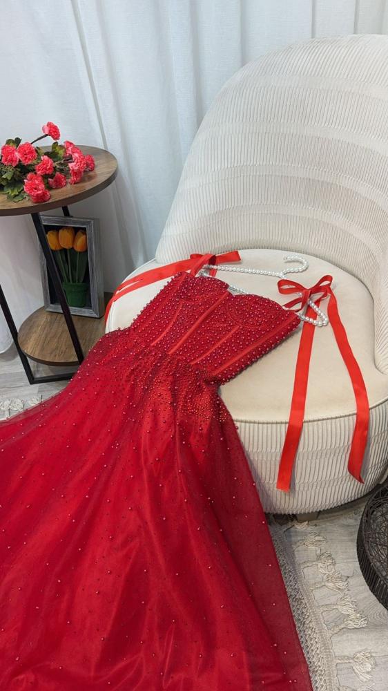 الوصف/ عبارة عن فستان سهرة طويل يأتي باللون العودي بقماش شيفون ناعم مطرز
