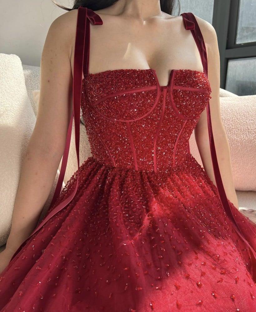 فستان سهرة فخم طويل لون عودي خامة شيفون مطرز
