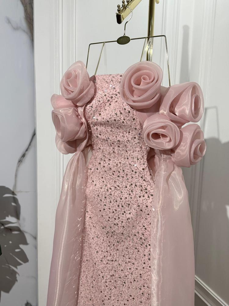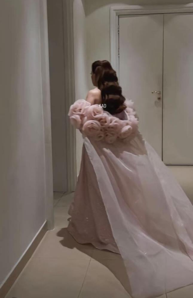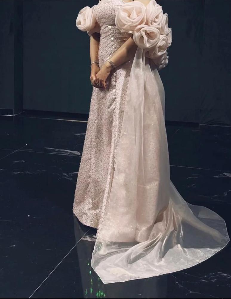 - الفستان يضمن إطلالة متألقة تلفت الأنظار، بفضل الجمع بين البريق الفاخر لقماش الترتر والرقي الذي تمنحه تفاصيل اللؤلؤ والورود.