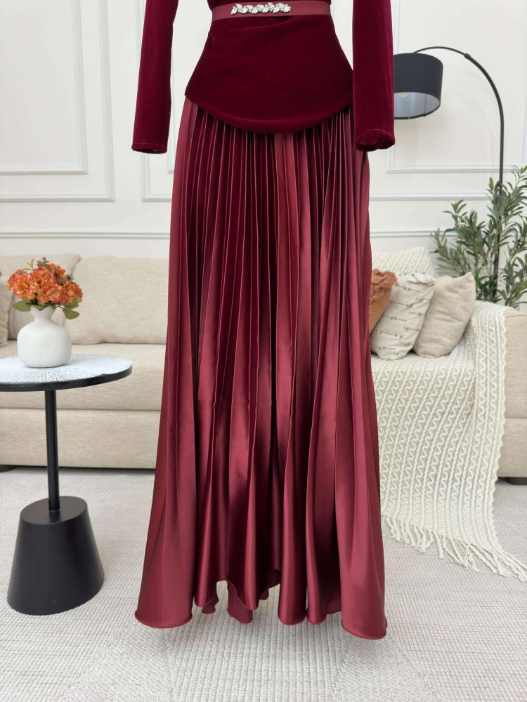 تتميز التنورة بأسلوب بليسيه متدفق يمنح الفستان لمسة عصرية مع الحفاظ على الأناقة الكلاسيكية، مما يجعلها مثالية للحركة والمناسبات الخاصة.