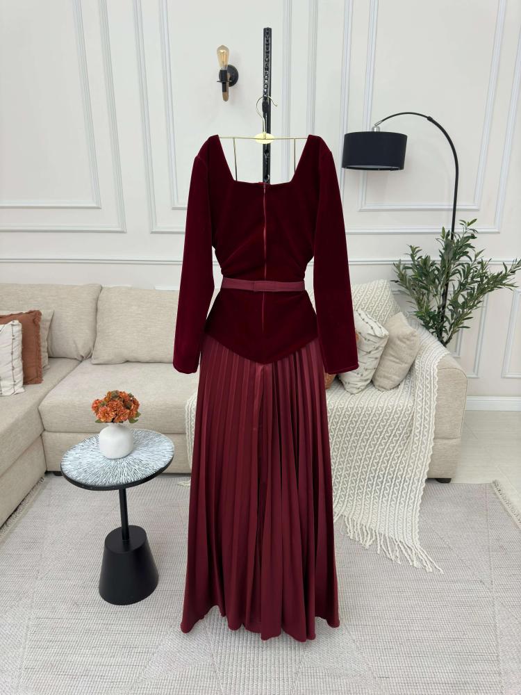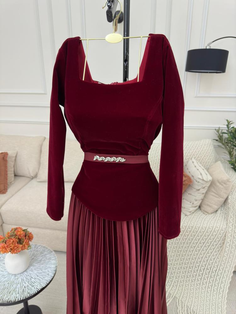 فستان مخملي خمري بلمسات فضية لإطلالة راقية
