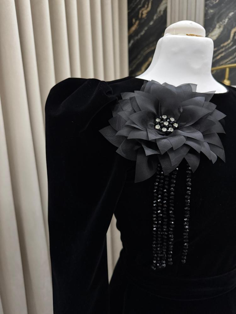 • منطقة الصدر مزينة بوردة مخملية بارزة وأحجار كريستالية تضيف لمسة من التألق والجاذبية.
