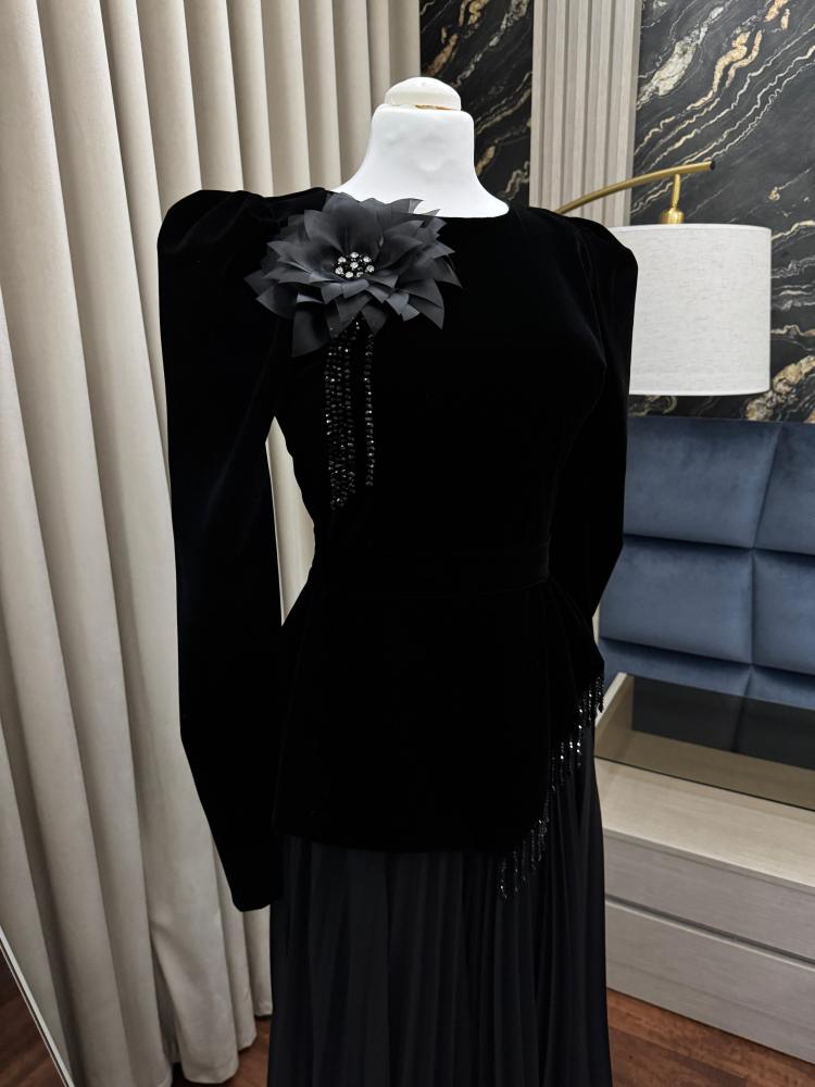 تصميم أسود أنيق من المخمل والشيفون مزين بالكريستال
