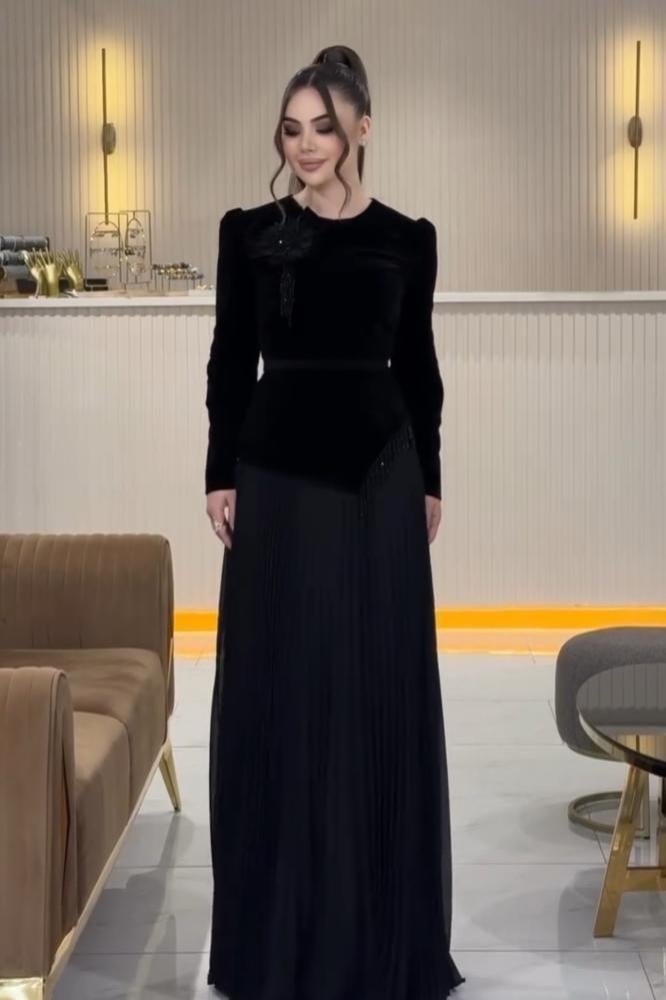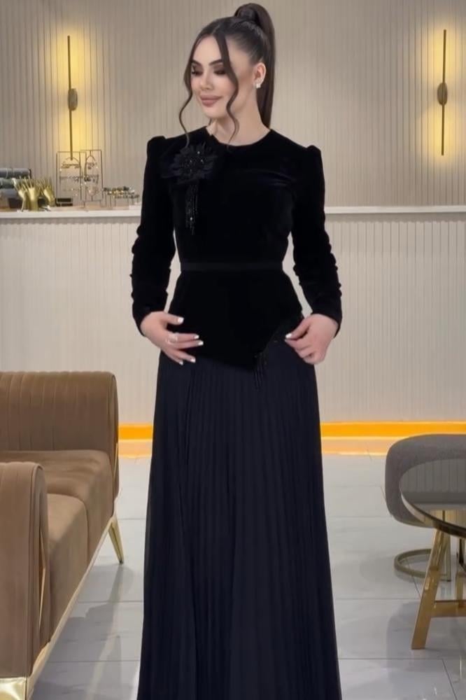 فستان سهرة أسود بتفاصيل مخملية وتنورة مكسرّة جذابة