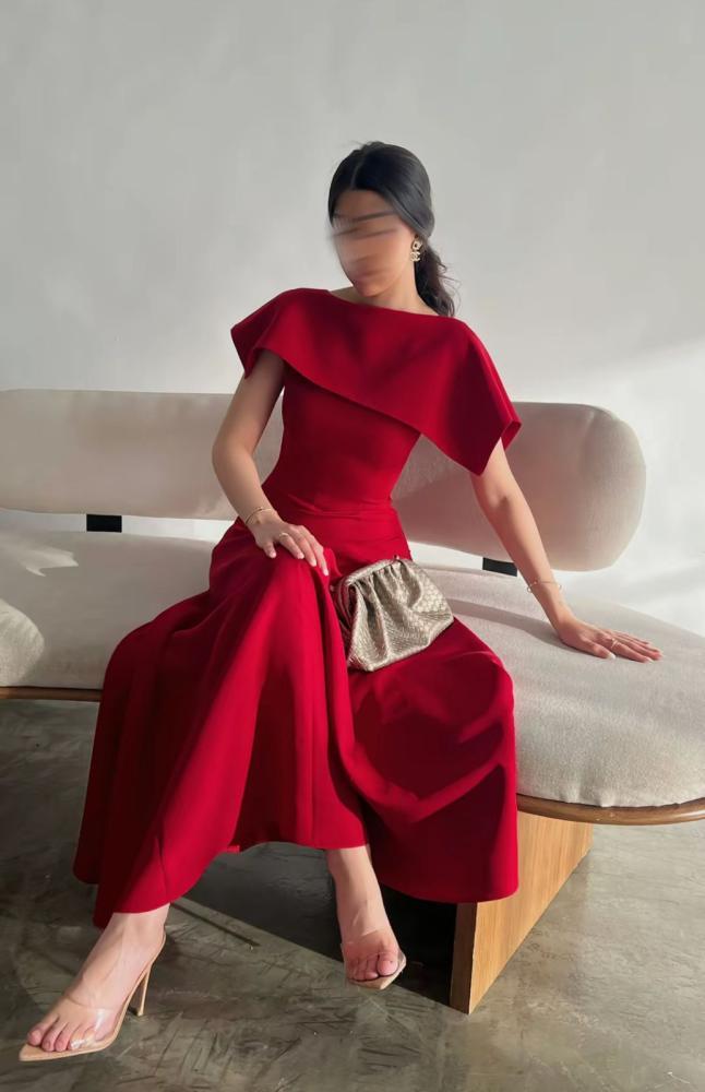 - الإكسسوارات المقترحة: حذاء بكعب شفاف، حقيبة يد صغيرة بلون ميتاليك، وأقراط ناعمة.