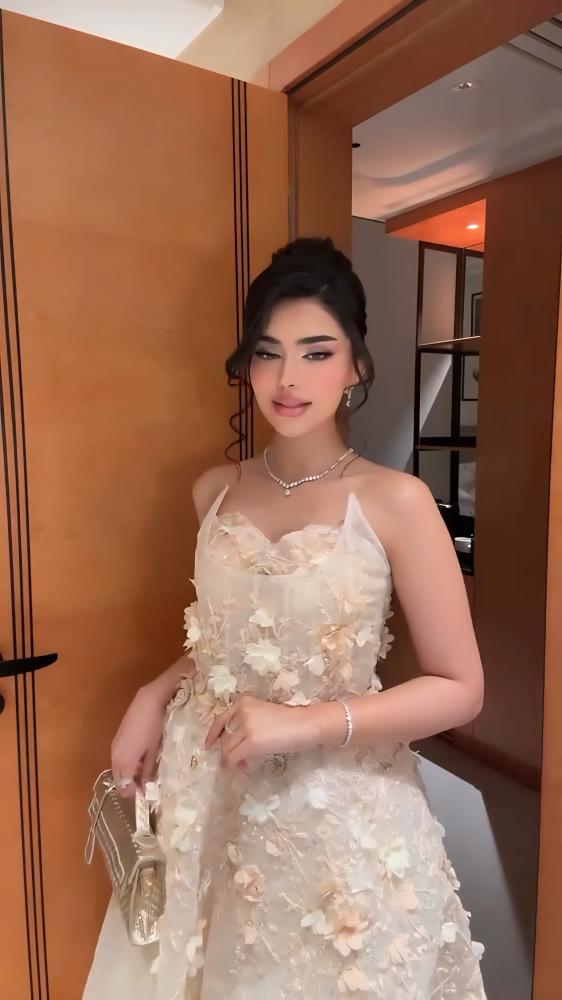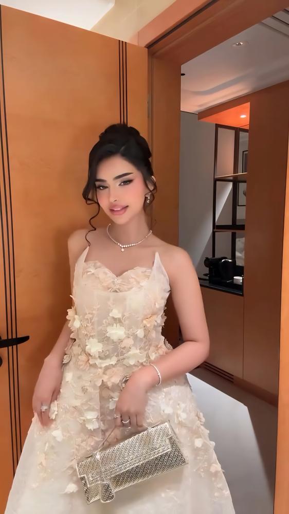 تتزين الطبقة الخارجية بورود ثلاثية الأبعاد موزعة بانسيابية على كامل الفستان، لتمنحك إحساساً بالرقي والرومانسية مع كل حركة. الصدر مصمم بقصة كورسيه ناعمة تدعم وتبرز جمال القوام، أما الخصر فمصمم بإتقان ليمنح مظهراً أنحف ومشدود. يأتي الفستان بدون أكمام مع تنورة واسعة تأخذ شكل الأميرات، تعزز من فخامة التصميم.