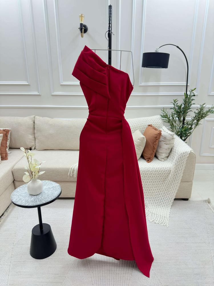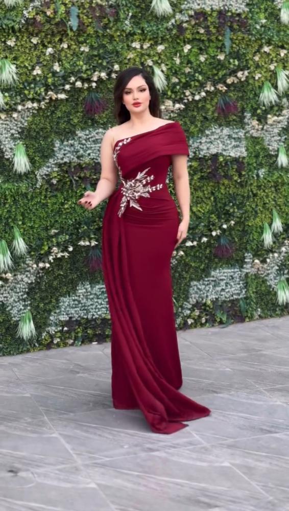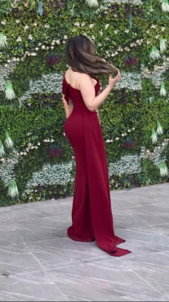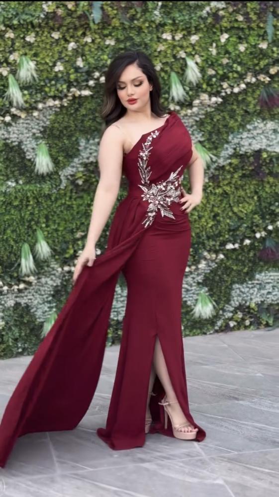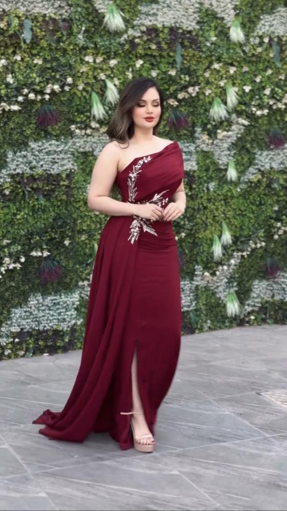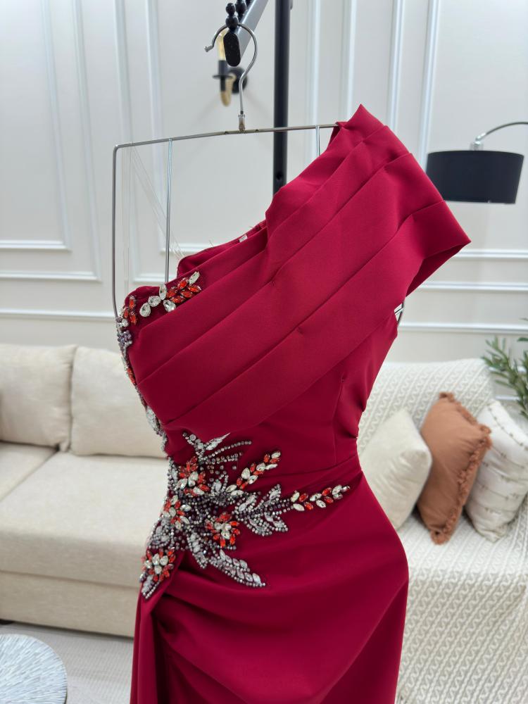 فستان احمر سهره كتف واحد مع فتحة جريئة وتطريز أنيق