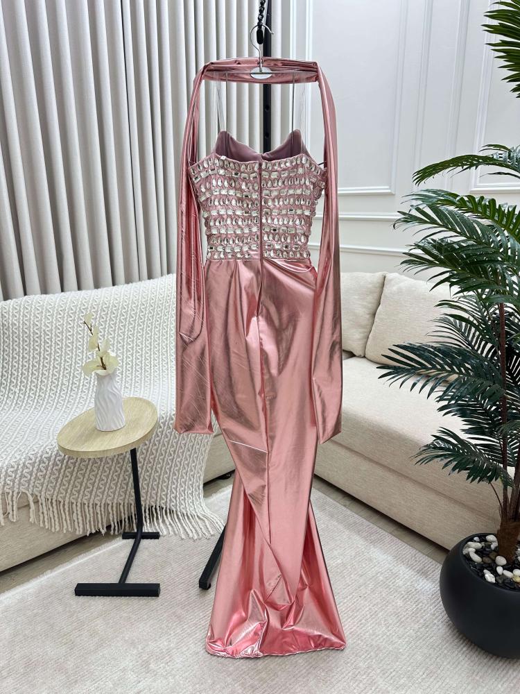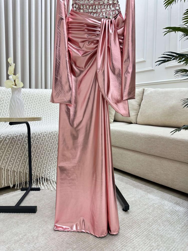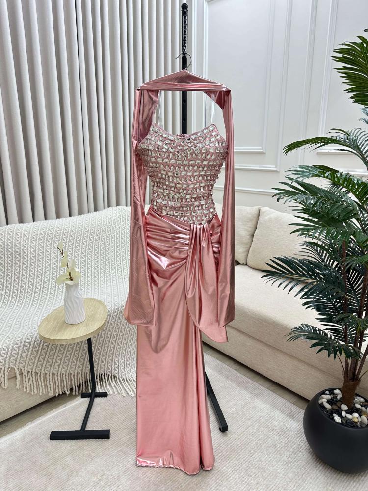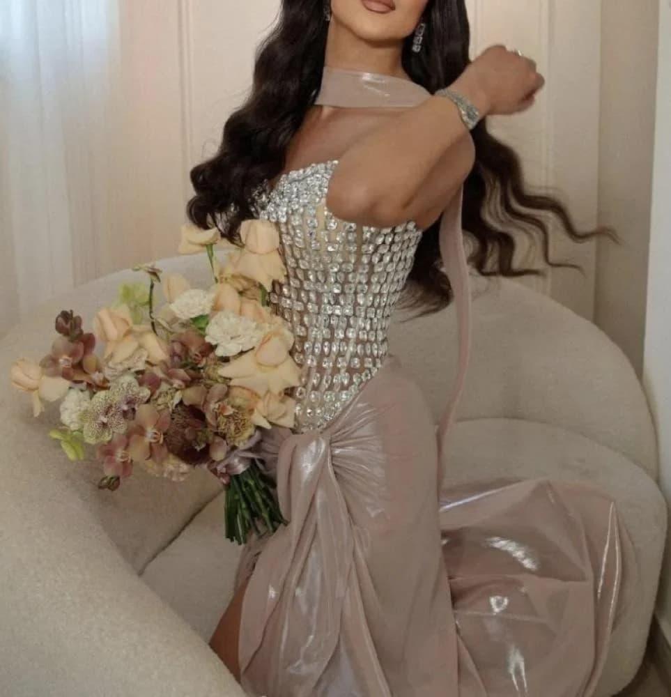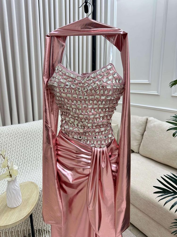 فستان سهرة Rose Gold بتصميم فاخر من الساتان والكريستال
