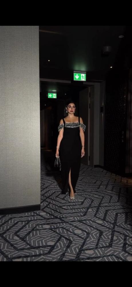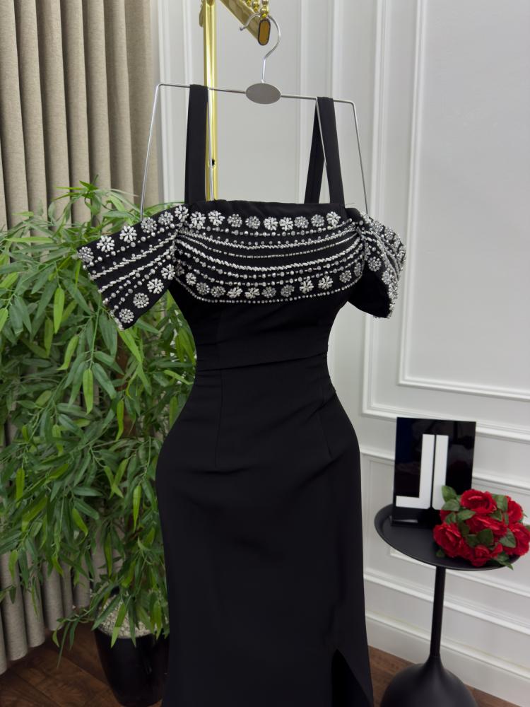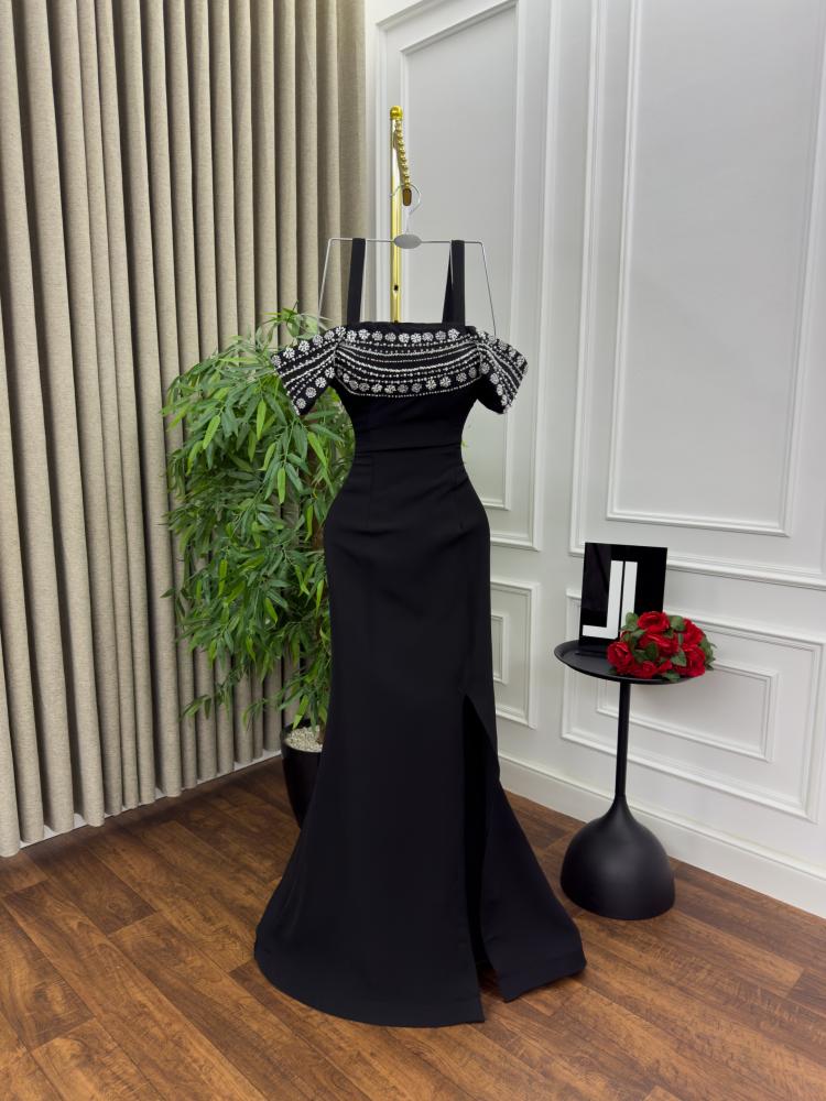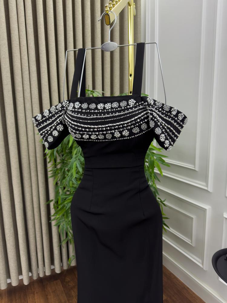 فستان سهرة أسود بتطريز فاخر من قماش الباربي