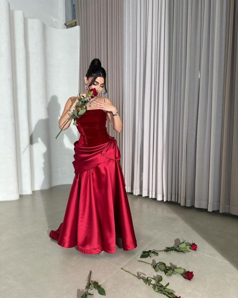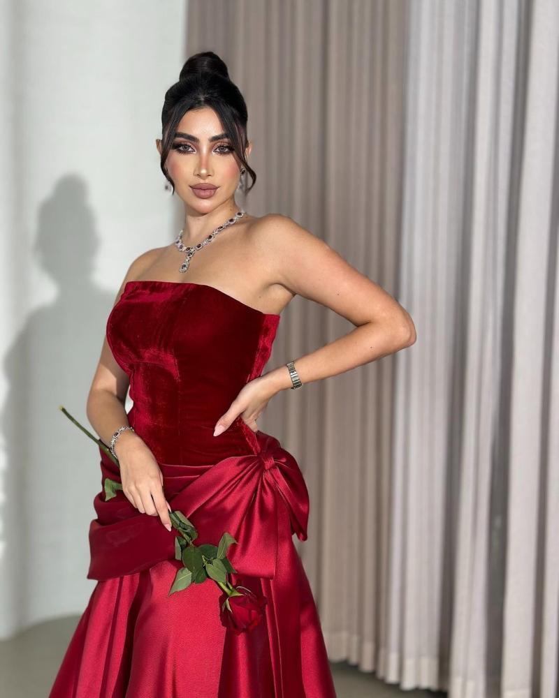 إطلالة مبهرة بفستان مخملي أحمر يعكس الجرأة والفخامة