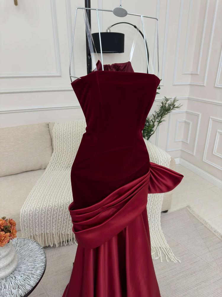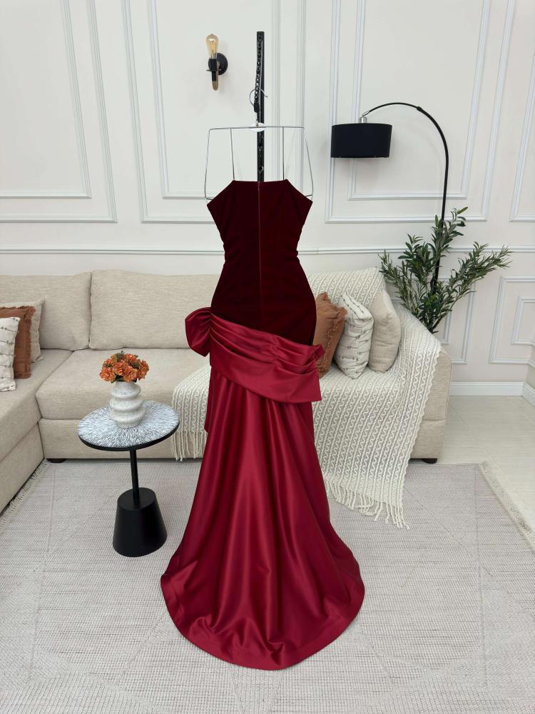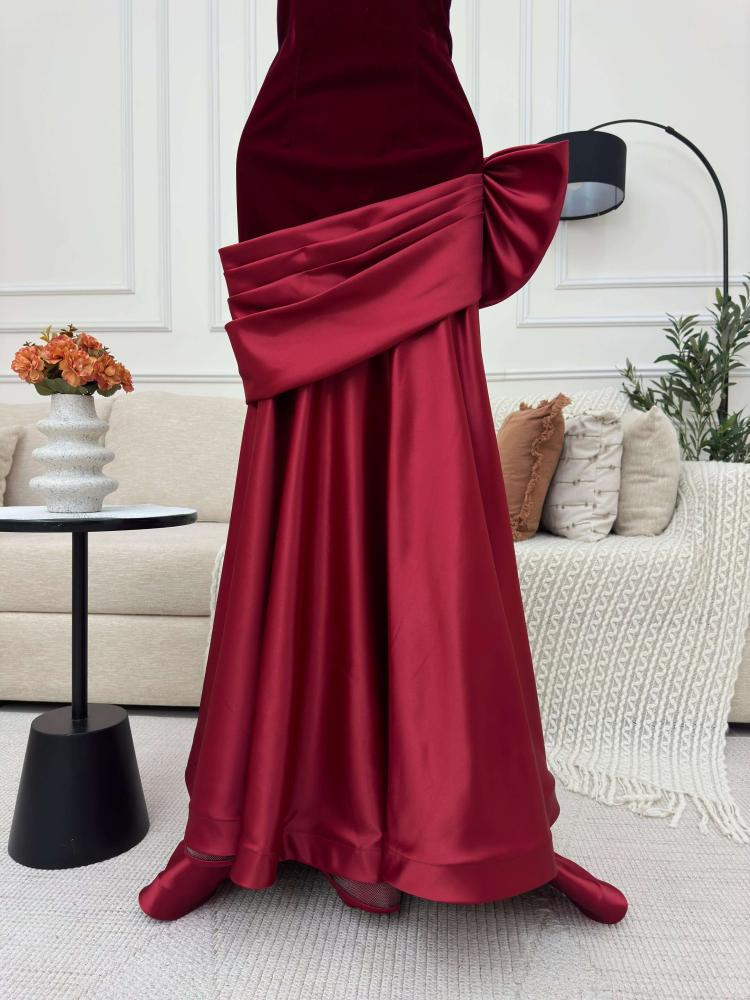 فستان خمري فاخر بتصميم مخمل وشيفون لإطلالة ملكية